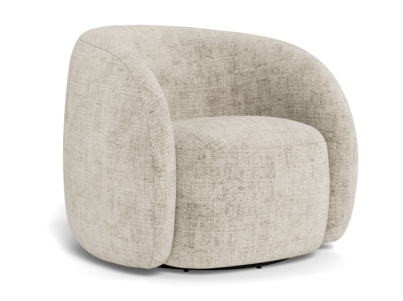 Fotel obrotowy o rzeźbiarskiej, organicznej formie tapicerowany tkaniną Juto w jasnobeżowym odcieniu z wyraźną, teksturowaną powierzchnią. Oparcie płynnie otula siedzisko, tworząc formę kokonu, który delikatnie otacza siedzącego. Czarna okrągła podstawa z funkcją obrotu pozwala na swobodne obracanie się o 360 stopni. Wymiary 81x83 cm i wysokość 76 cm sprawiają, że fotel ma wyraźną, masywną formę przykuwającą uwagę w każdej przestrzeni.