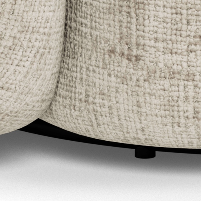 Tapicerka jest wykonana z tkaniny Juto w jasnobeżowym odcieniu z bardzo wyraźną, teksturowaną powierzchnią przypominającą bouclé. Struktura składa się z grubych pętelek i nieregularnych splotów, które tworzą bogatą, trójwymiarową fakturę. Materiał ma wyraźnie widoczny splot z cienkimi czarnymi akcentami wplecionymi w jasnobeżową podstawę, co dodaje tkaninie głębi.