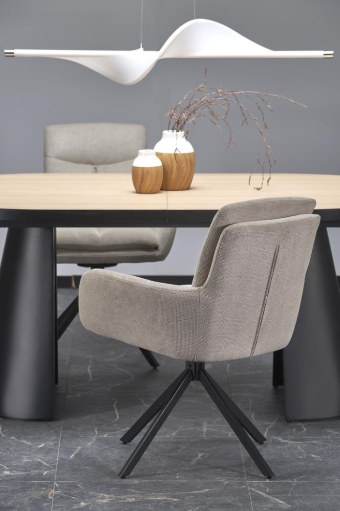 Stół rozkładany Giacomo pięknie komponuje się z krzesłami w różnych stylach. Możesz wybrać krzesła w naturalnych odcieniach drewna dla harmonijnej całości, czarne krzesła nawiązujące do nóg stołu i krawędzi blatu, skandynawskie krzesła z drewnianymi nogami i tapicerowanymi siedziskami, lub nowoczesne krzesła w bieli czy szarości dla świeżości. Owalny kształt pozwala na elastyczne rozmieszczenie krzeseł.