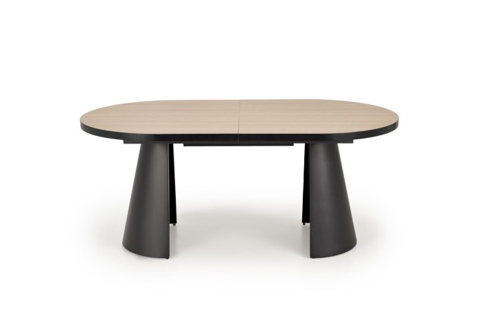 Konstrukcję stołu rozkładanego tworzą dwie stożkowe nogi wykonane ze stali malowanej proszkowo na czarny kolor. Ta nowoczesna, rzeźbiarska forma nadaje meblowi wyrazistego, designerskiego charakteru. Metalowe nogi w głębokim czarnym kolorze tworzą efektowny kontrast z jasnym, naturalnym blatem, wprowadzając do kompozycji równowagę między ciepłem drewna a chłodem metalu.