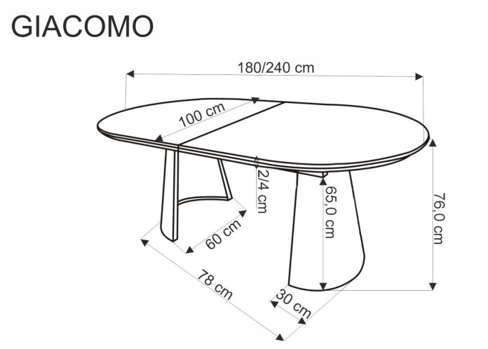 Stół Giacomo oferuje praktyczny mechanizm rozkładania, który z łatwością dostosuje rozmiar mebla do Twoich potrzeb. W wersji złożonej mierzy 180 cm długości, wygodnie mieszcząc 6 osób podczas codziennych posiłków. Po rozłożeniu osiąga 240 cm, zapewniając komfortowe miejsce dla 8 osób podczas rodzinnych spotkań, przyjęć czy uroczystości. Szerokość 100 cm gwarantuje wystarczająco dużo miejsca dla wszystkich siedzących.