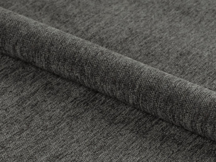Struktura tkaniny jest miękka w dotyku, charakterystyczna dla szenilu. Ciemnoszary odcień ma głębię – nie jest płaską czernią ani zimną szarością, ale ciepłym, nasyconym tonem z subtelnymi przejściami koloru. Tkanina przyjemna podczas siedzenia, choć jak każdy materiał z nicią szenilową wymaga delikatnego traktowania i unikania ostrych przedmiotów.