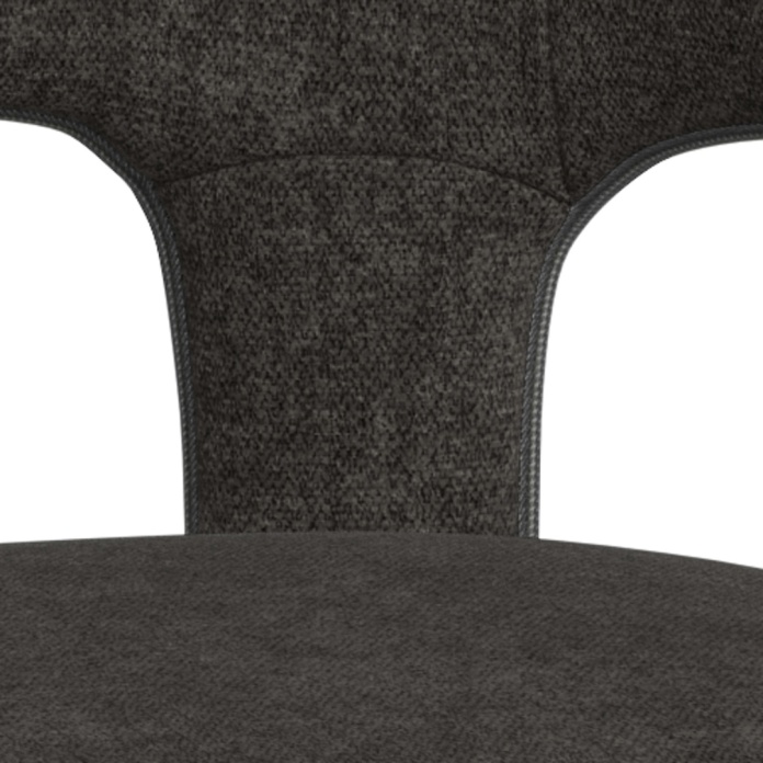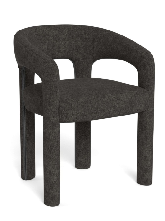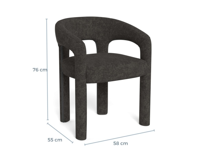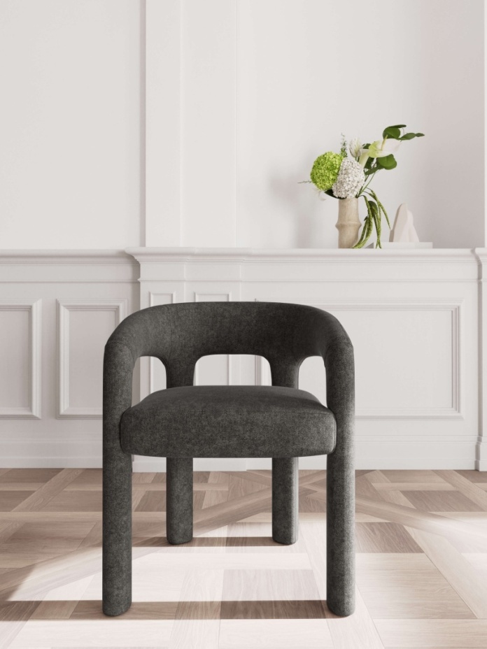 Krzesło jadalne o artystycznej, rzeźbiarskiej konstrukcji w pełni tapicerowane ciemnoszarą tkaniną Apia z wplecioną nicią szenilową. Cztery masywne, cylindryczne nogi i charakterystyczne zaokrąglone wycięcia w oparciu tworzą wyrazistą formę przypominającą współczesną rzeźbę. Sprężyny kieszeniowe w siedzisku zapewniają komfort, a ciemnoszara kolorystyka wprowadza elegancję i uniwersalność. Krzesło posiada zdejmowaną tapicerkę (zamki są dyskretnie umieszczone wzdłuż krawędzi krzesła), co ułatwia utrzymanie mebla w czystości.