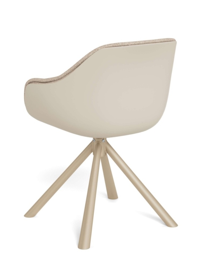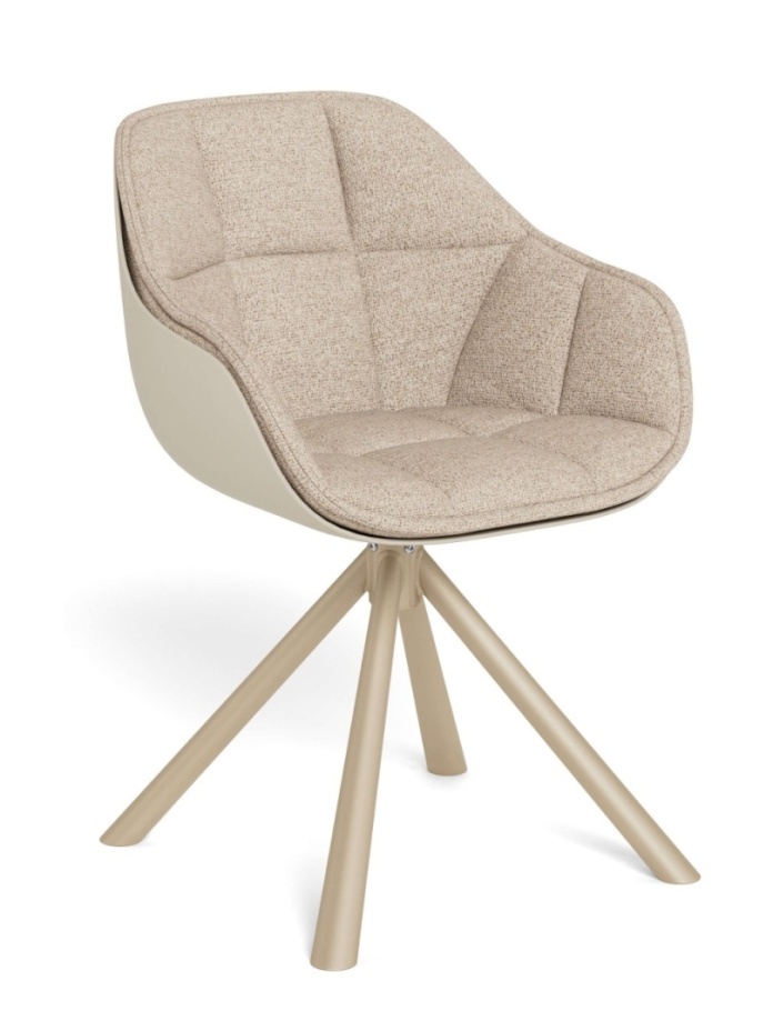 Krzesło jadalne z podłokietnikami wykonane z wytrzymałego polipropylenu, tapicerowane miękką, zdejmowalną poduszką, która zachowuje swój kształt nawet po praniu w pralce. Beżowa tkanina Cona o strukturze przypominającej bouclé, kwadratowe przeszycia dekoracyjne i beżowa stalowa podstawa tworzą stonowaną, monochromatyczną kompozycję. Funkcja obrotu i zdejmowana poduszka, którą można wyprać w pralce, to praktyczne rozwiązania dla codziennego użytkowania.