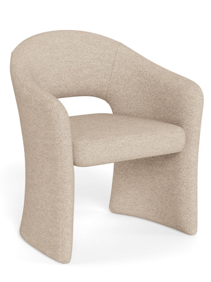 Krzesło jadalne o organicznej, płynnej formie wykonane w całości z miękkiej tkaniny Cona w beżowym odcieniu, o strukturze przypominającej bouclé. Charakterystyczna konstrukcja na dwóch nogach i zaokrąglone linie nadają meblowi rzeźbiarski, artystyczny charakter. Tapicerowane podłokietniki płynnie przechodzą w oparcie, tworząc całość, która otula siedzącego. Zdejmowana tapicerka siedziska ułatwia utrzymanie w czystości.