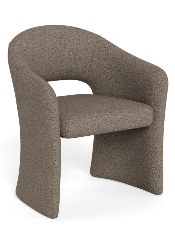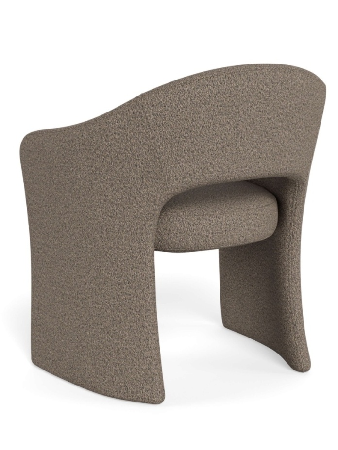Krzesło jadalne o płynnej, organicznej sylwetce tapicerowane tkaniną Cona w odcieniu taupe o strukturze bouclé. Miękkie, zaokrąglone linie i nietypowa konstrukcja na dwóch szerokich nogach tworzą formę przypominającą rzeźbę. Podłokietniki płynnie przechodzą w oparcie bez ostrych krawędzi czy widocznych połączeń – całość tworzy jednolitą, tapicerowaną powierzchnię. Zdejmowana tapicerka to praktyczny element ułatwiający czyszczenie.