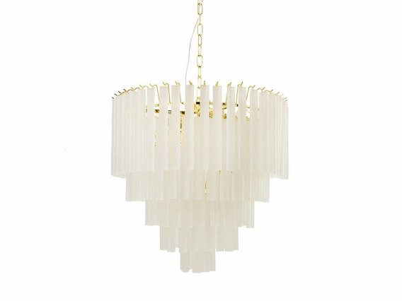 Wykonana ze stali, z kloszami z mlecznobiałego, matowego szkła, lampa subtelnie rozprasza światło, wprowadzając do wnętrza ciepły i przytulny nastrój.