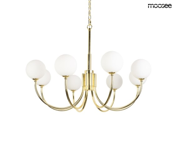 Złota metalowa rama wspiera kuliste, mleczne szklane klosze, tworząc efektowną i nowoczesną formę.