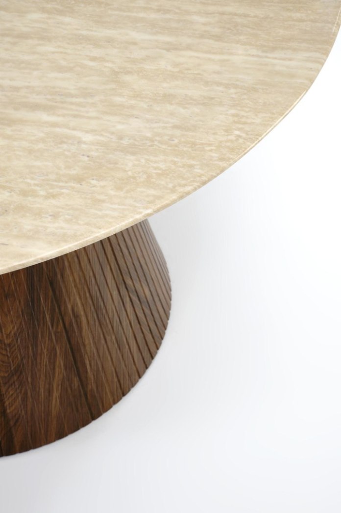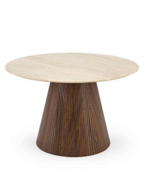 Wymiary: fi120/76 cm, materiał: marmur lakierowany / MDF okleinowany, kolor: blat - trawertyn, nogi - orzechowy