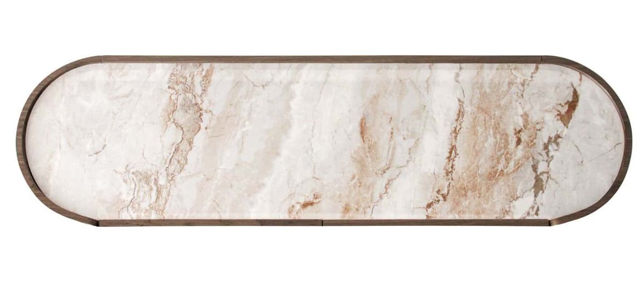 Blat wykonano z ceramiki w dekorze przypominającym naturalny marmur – kremowa baza z delikatnymi, brązowo-beżowymi żyłkami. To nie przypadek, że Richmond wybrał ceramikę. W przeciwieństwie do naturalnego kamienia, ceramika nie wymaga impregnacji, nie wchłania plam ani wilgoci, a jej powierzchnia pozostaje równie piękna przez lata. Jest lżejsza od kamienia, co ma znaczenie przy meblach tej skali, a jednocześnie równie odporna na zarysowania i uszkodzenia mechaniczne.