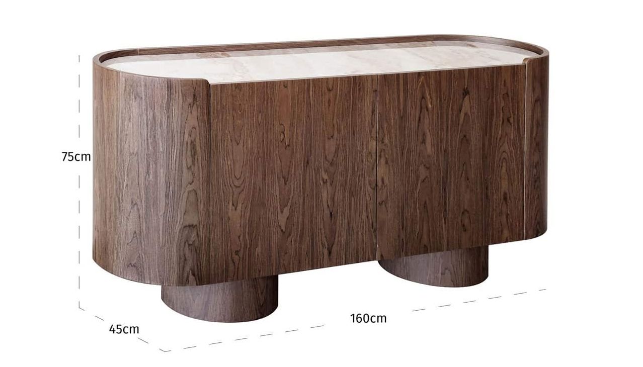 Callahan to nowość w kolekcji Richmond Interiors, która łączy w sobie dwie cechy rzadko spotykane w jednym meblu – wyrazistą, niemal rzeźbiarską bryłę i codzienną funkcjonalność. Owalna forma z charakterystycznymi cylindrycznymi nogami natychmiast przyciąga wzrok, ale to ceramiczny blat sprawia, że mebel ten wykracza poza standardy typowej komody.