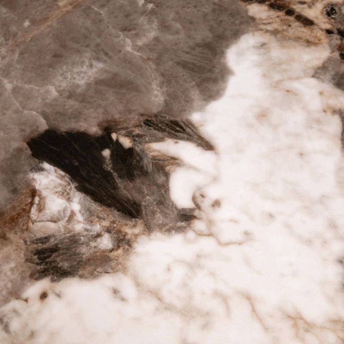 Langford to stół, który od pierwszego wejrzenia przyciąga wzrok. Owalny blat z ceramiki w wyrazistym wzorze – ciemnobrązowe plamy na kremowym tle – wygląda jak abstrakcyjne malowidło. To nie subtelne żyłki jak w marmurze, ale intensywne, organiczne formy, które nadają stołowi wyraźną obecność w przestrzeni.