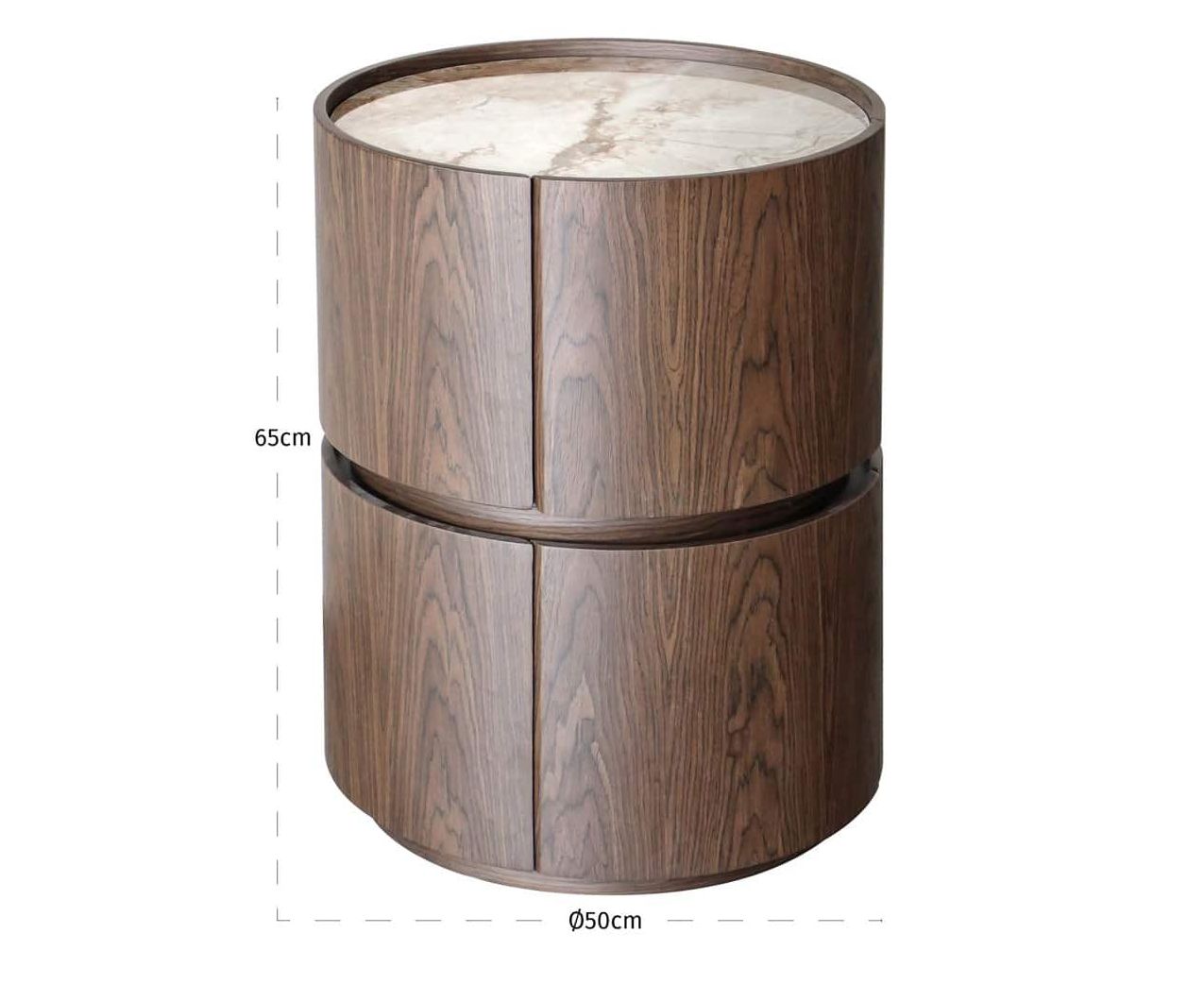 Ellery to stolik dla osób, które szukają kompaktowego mebla z charakterem, który łączy prostotę formy z jakością materiałów premium. Cylindryczna bryła o średnicy 50 cm sprawia, że stolik zmieści się w wąskim fragmencie salonu, przy łóżku lub fotelu, nie zajmując tyle miejsca co tradycyjny stolik kwadratowy czy prostokątny. Ciepły brązowy fornir w połączeniu z ceramicznym blatem o delikatnym rysunku kamienia tworzy harmonijny efekt wizualny.