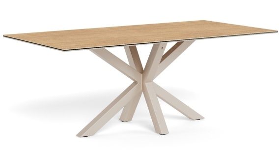 Prostokątny stół łączący nowoczesny design z praktycznością ceramicznego blatu. Powierzchnia o wymiarach 200x100 cm komfortowo pomieści 8 osób przy wspólnym posiłku. Blat z ceramiki imitującej dziki dąb w ciepłym, brązowym odcieniu i geometryczna podstawa w kształcie X w kaszmirowym szarym wykończeniu tworzą wyrazistą, nowoczesną kompozycję.