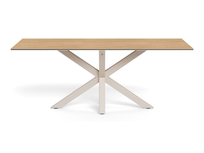 Konstrukcja X wykonana jest ze stali malowanej proszkowo na kolor kaszmirowy. Wykończenie to matowa powierzchnia, która nie odbija światła i zachowuje swój wygląd przy codziennym użytkowaniu. Geometryczna forma równomiernie rozprowadza ciężar blatu, zapewniając stabilność nawet przy pełnym obciążeniu.