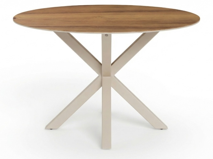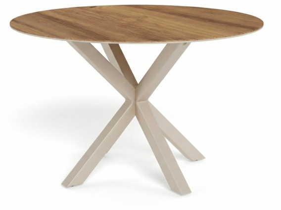 Okrągły stół o średnicy 119 cm dla 4 osób. Ceramiczny blat z wzorem dzikiego dębu w ciepłym, rdzawo-brązowym odcieniu i kaszmirowa stalowa podstawa w formie X tworzą nowoczesną kompozycję łączącą naturalną estetykę z przemysłowymi materiałami. Okrągły kształt sprzyja rozmowom – wszyscy siedzą w równej odległości od siebie, bez hierarchii miejsc.