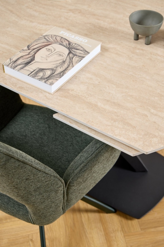 W jadalni, gdzie stół jest używany codziennie, ale czasem trzeba go powiększyć. W salonie połączonym z kuchnią, gdzie liczy się przestrzeń i nie ma miejsca na przechowywanie dostawek. W mieszkaniu, gdzie liczba gości zmienia się w zależności od okazji. Owalny kształt i połączenie piaskowego beżu z czarną stalą pasuje do wnętrz w stylu contemporary, scandinavian, japandi czy industrial soft – wszędzie tam, gdzie liczy się funkcjonalność i minimalistyczna estetyka.